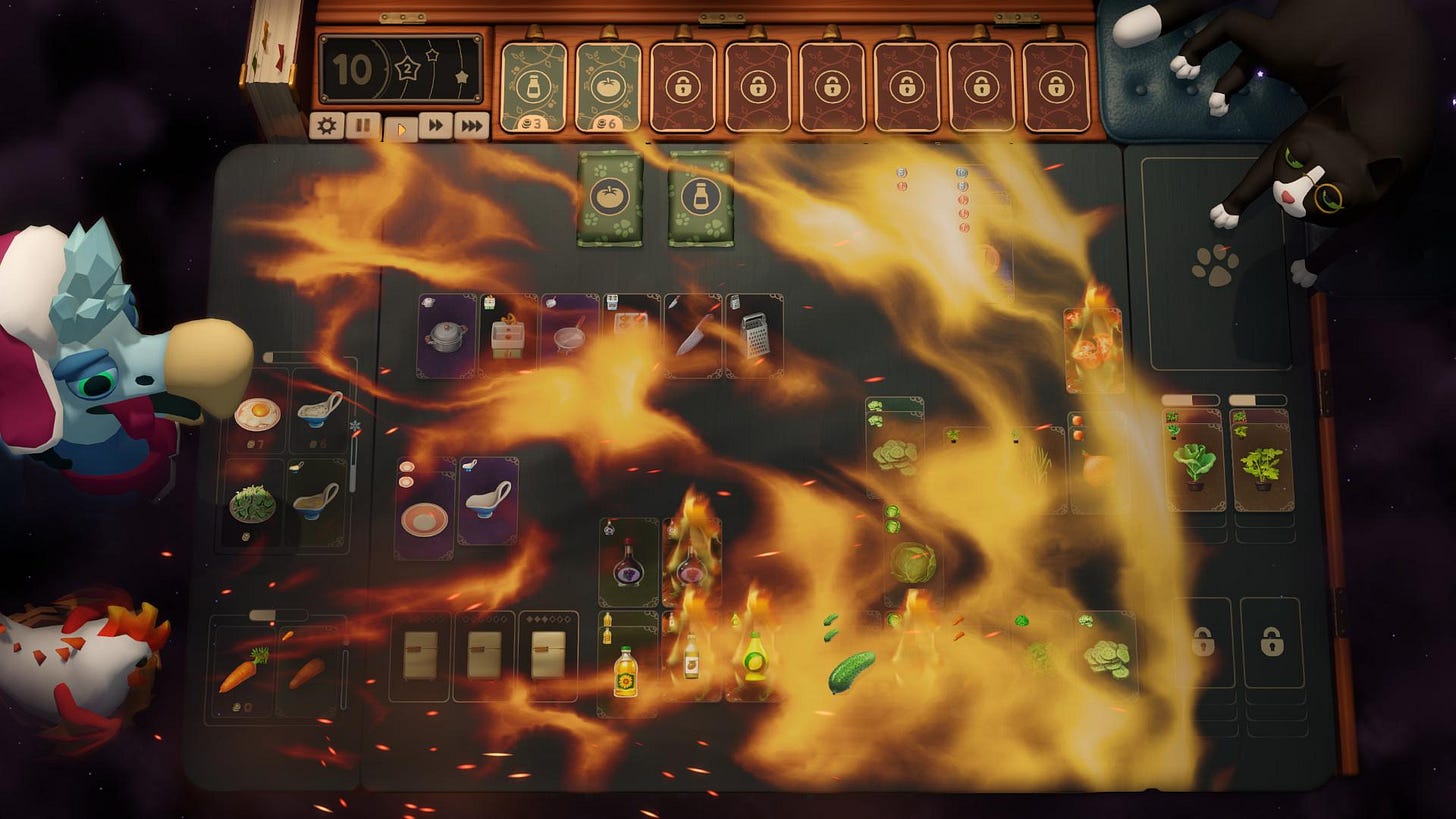 You have access to condiments as well. If you’re missing an ingredient, you can buy a card pack from the required category and hope luck is on your side. The cute cat in the corner will buy any cards you’re not using in case you need more coins to buy packs. Once your ingredients are ready, put them on a plate and serve them to your customer. Pause the game, accept payment, extra cards, and dirty dishes, and reorganize for the next customer. Each customer demands their dish within a specific time window; failing that will result in a failing grade.