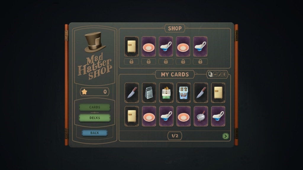 Between levels, you can hop into the Mad Hatters Shop to buy new cards, like an extra stove or knife, or a plate that will make your prep easier.