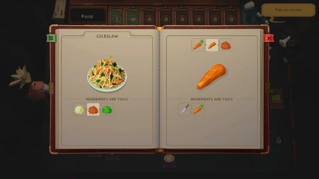 You have a small selection of cards at the start of your level, a mixture of appliances (stove and sink), gadgets, cookware (pots, pans, and casserole dishes), dishware (plates and sauce boats), ingredients and money. Customers sit down and order their item. Here I will talk about your best friend, the pause button. While you can speed up the game, you want to pause it while doing all your organizing/prep because you have a finite amount of time to complete all the dishes. Feel free to organize your workspace as needed, but I found grouping items together worked best for me. If you have any dirty dishes, stack them at the sink. If you have any plants that need to be grown for the dish required, pop them onto the garden plot card. Look at the menu item requested and determine what needs to be done, Do you need to peel, slice, chop, grate, boil, mash, etc.? I pass on the knife will peel or slice depending on the veg, multiple passes on the knife and you will end up with dicing. A knife will also open and tin cans you have. None of your actions will progress until the game is no longer paused, so once your plan is made, it’s go time. Menu orders may require multiple steps, especially in later round, and can combine different preparation techniques including cold and hot items combined. For example, one of the first recipes you learn is for coleslaw. Place the carrot on the knife to peel it, then on the grater to grate it, grate your cabbage and slice your parsley. Combine these three items on a clean plate to create coleslaw. If you mess up one of your ingredients, it won’t let you combine them, but you will lose a lot of time this way.
