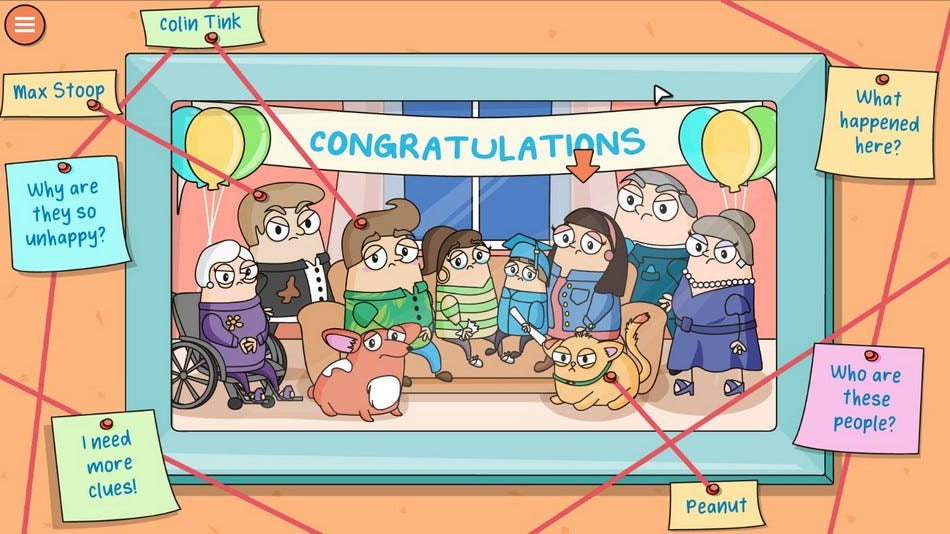 The Case of the Worst Day Ever. Sounds pretty dramatic, doesn’t it? Like that friend who stubs their toe, and now the world is ending. Honestly, this game might be more dramatic in the best possible way. We start with a family photo where everyone looks miserable, even the family pets. Each family member represents one of the ten cases/chapters, and we get to find out what made their day the absolute worst day ever.