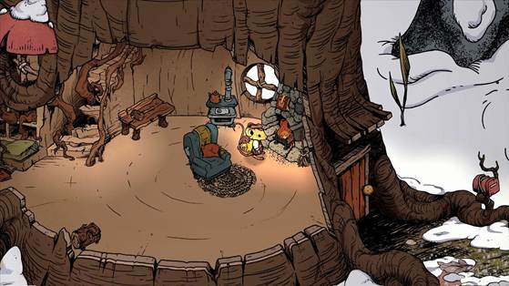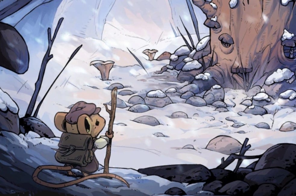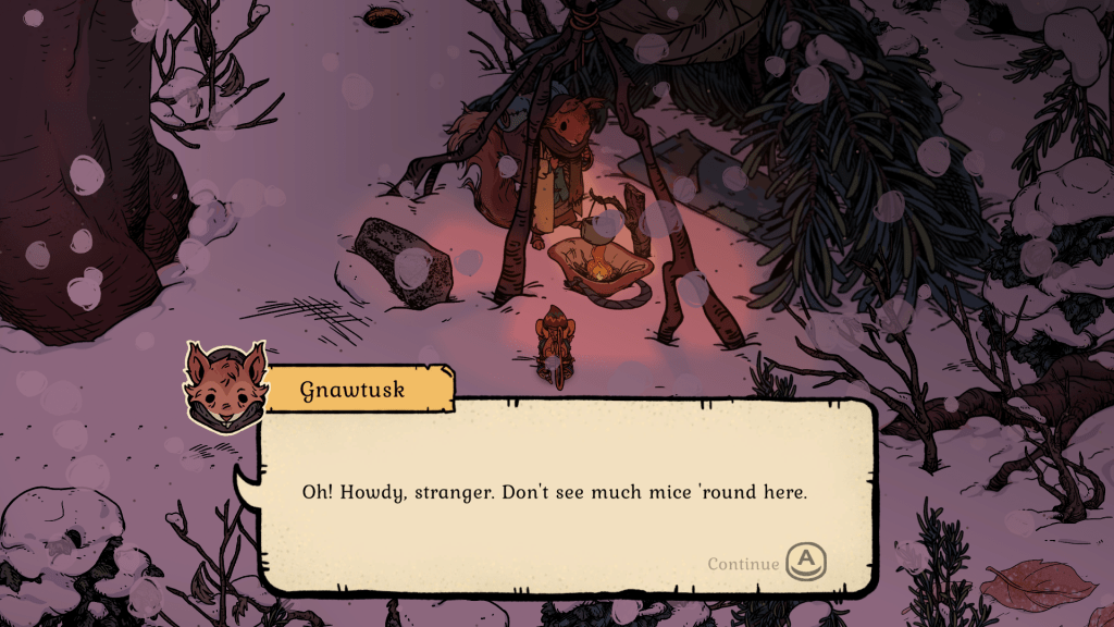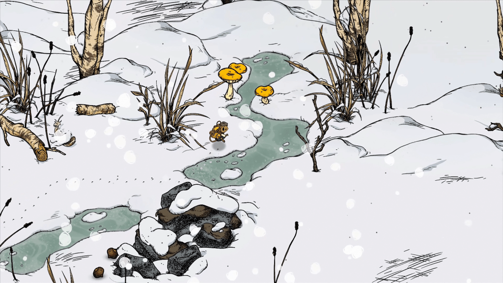 Winter Burrow’s graphic style is simply delightful. It’s reminiscent of a hand-illustrated children’s book. Charming. Your tiny mouse will leave even tinier footprints in the show as you meander the wilderness. This is extremely helpful when trying to retrace your steps to get back to your home, as there is no map at all. I found this to be pretty stressful when faced with the possibility of freezing to death or running out of inventory space and having to head home. These were both common situations, especially in the beginning, when you only have nine inventory slots. Three of which are taken up by your trusty axe, pickaxe, and shovel (all essential to scavenging). Add in a snack or two, and inventory slots are limited. This doesn’t really get much better as you move along, either. Despite opening more inventory slots, you are often running out of space, especially if you choose to bring kindling to start a fire with you as well.
