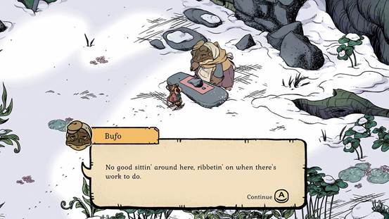 Winter Burrow does include a hint of the Metroidvania genre as well. As you acquire crafting recipes from the woodland critters you encounter, you will be able to access areas of the forest you previously weren’t able to. Now, larger maps to explore and still no map…you can see why this can be frustrating, trying to navigate unless you’re diligent in making notes of landmarks as you move around. The stamina bar may have been the most frustrating to control; a few swings of an axe, and it was depleted. Yes, stopping activities lets it replenish, but this means everything takes longer than it should. Especially dangerous when you’re also combating the cold, hunger, and aggressive insects.
