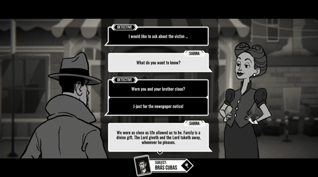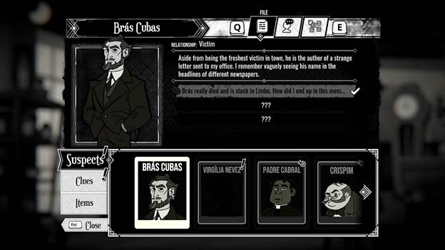 Inspired by Machado de Assis’s rich literary works, it was much more complex than I expected. The narrative is engaging, the noir aesthetic of 1930’s Brazil is exceptionally captured, and the soundtrack is full of personality. While I have played games with a time loop mechanic in the past, it is so well done in The Posthumous Investigation that it kept me engaged and not bored or annoyed, as is often the case with this sort of mechanic.
